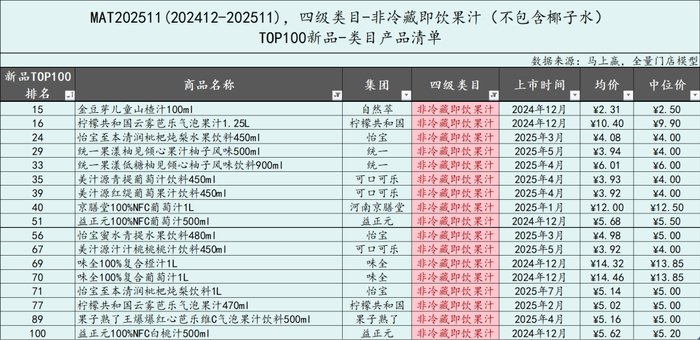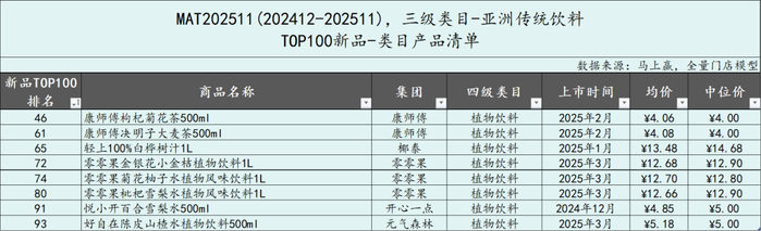 在MAT2511的饮料类目TOP100新品中,还有高达20个集团有1款新品上榜,其中既有老牌饮料集团,也有许多新鲜名字,值得进一步观察其未来表现。