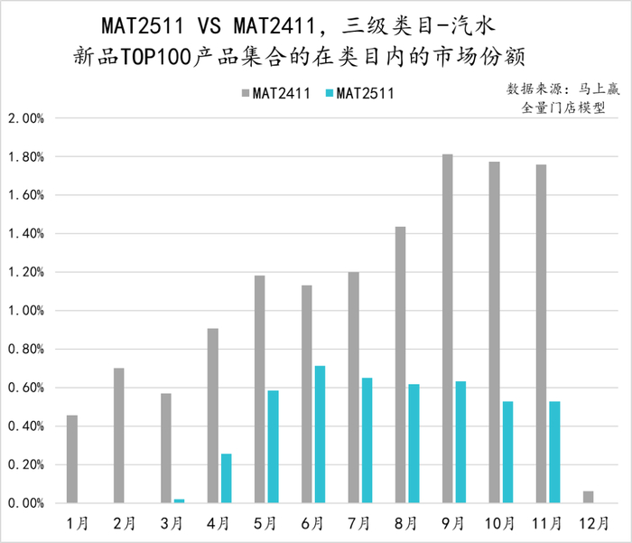 从包装水类目内TOP100新品的各月市场份额来看,MAT2511与MAT2411相比明显表现更弱,或许也与去年的TOP新品中有农夫山泉的“绿水”有关。不同于MAT2411的市场份额快速攀升,MAT2511市场份额始终未超过1%,旺季表现平平。