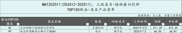 植物蛋白饮料类目仅有2款产品进入新品TOP100,分别来自壹桶饮料和味全,两款产品均为椰子乳,排名均在50名及以后。