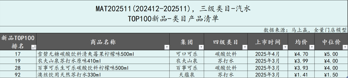 汽水类目共有4款产品上榜MAT2511新品TOP100,两款为碳酸饮料两款为苏打水。集团归属上,分别归属于可口可乐、农夫山泉、百事可乐和天蕴泉四个集团。其中,可口可乐的雪碧新口味、农夫山泉的苏打水,以及百事生可乐线的柠檬味生可乐表现较好,均位列排名前30。