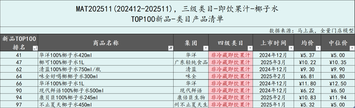 在即饮果汁类目中,椰子水类型产品也在今年的TOP新品中占据了相当大的比例,共有8款产品在MAT2511进入到TOP新品中。产品类型都是100%椰子水产品,来自7个不同的集团,规格245ml到1L均有覆盖。